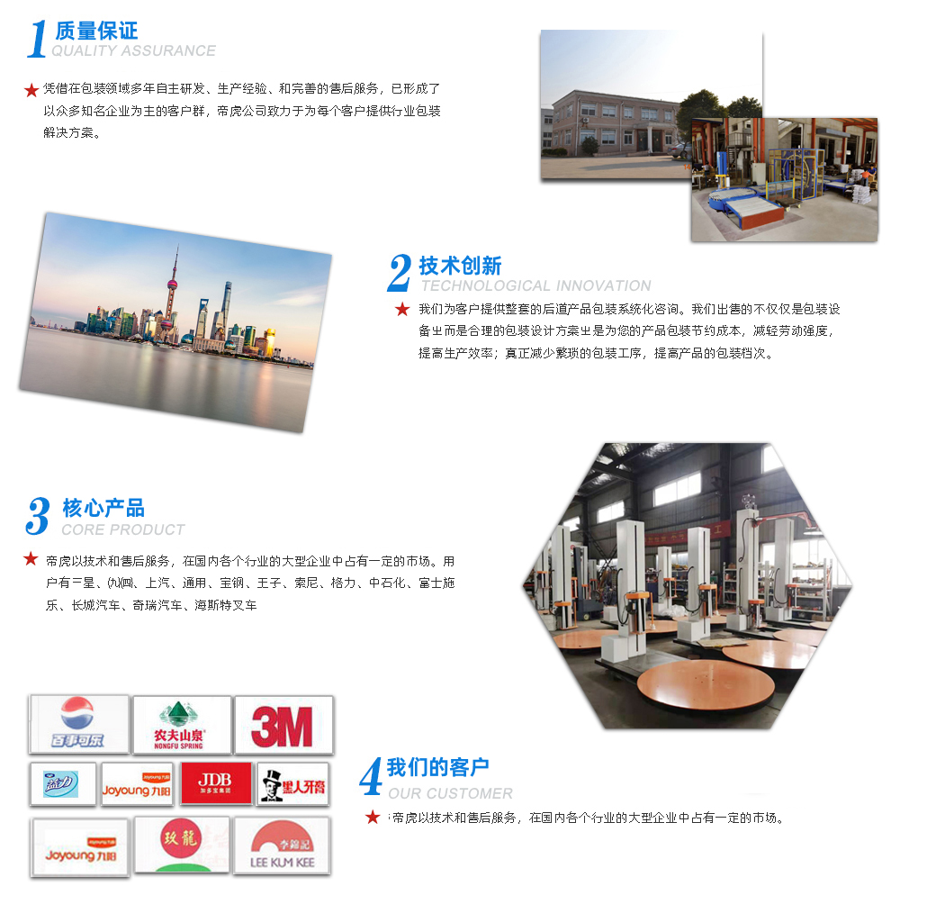 帝虎包裝設(shè)備(上海)有限公司是一家從事現(xiàn)代物流一體化運(yùn)輸包裝解決方案的專業(yè)提供商!公司自成立至今,憑借在包裝領(lǐng)域多年自主研發(fā)、生產(chǎn)經(jīng)驗(yàn)、和完善的售后服務(wù),已形成了以眾多知名企業(yè)為主的客戶群,帝虎公司致力于為每個(gè)客戶提供行業(yè)包裝解決方案。